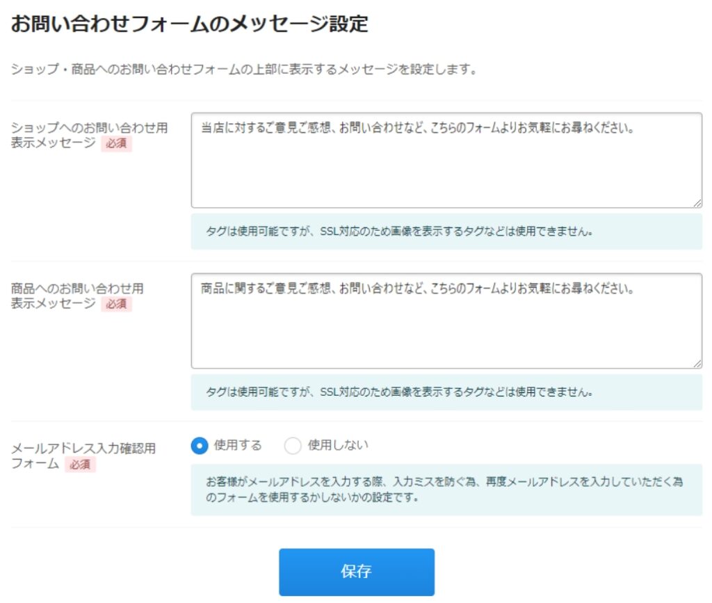 フォームは「ショップへのお問い合わせ用メッセージ」と「商品へのお問い合わせメッセージ」に分けられています。