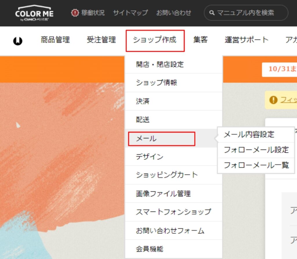 画面上部の共通メニューより「ショップ作成」>「お問い合わせフォーム」をクリックして、お問い合わせページに表示するメッセージを入力する画面に移動します。