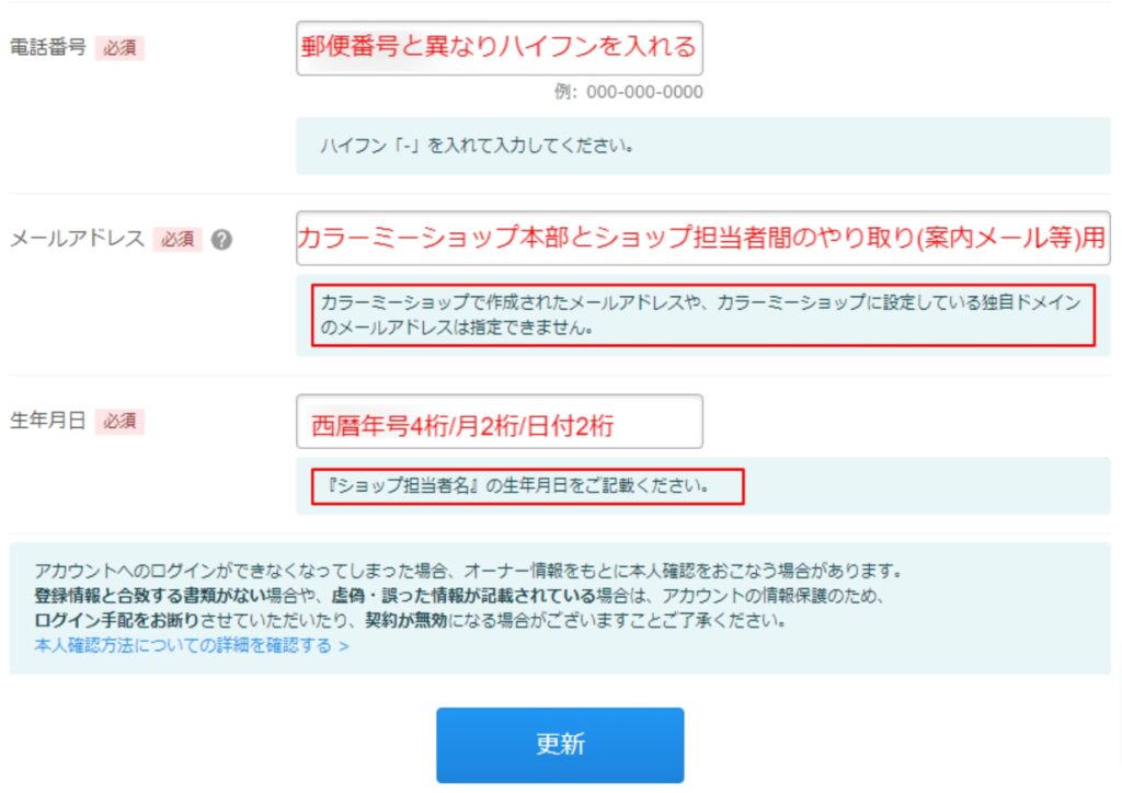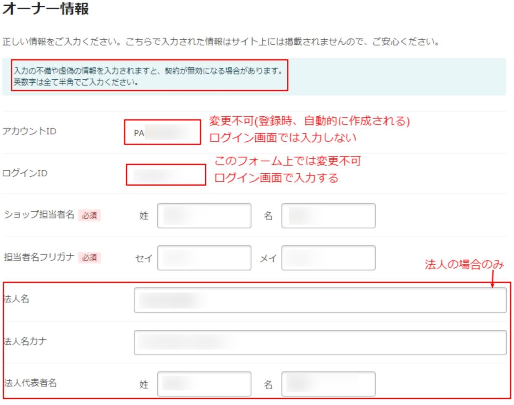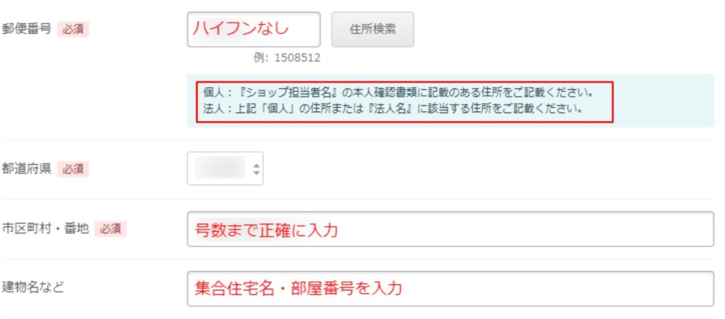 (2)法人の場合、住所関係のフォームには「ショップ担当者の本人確認書類上の住所」もしくは「法人所在地の情報」を入力します。