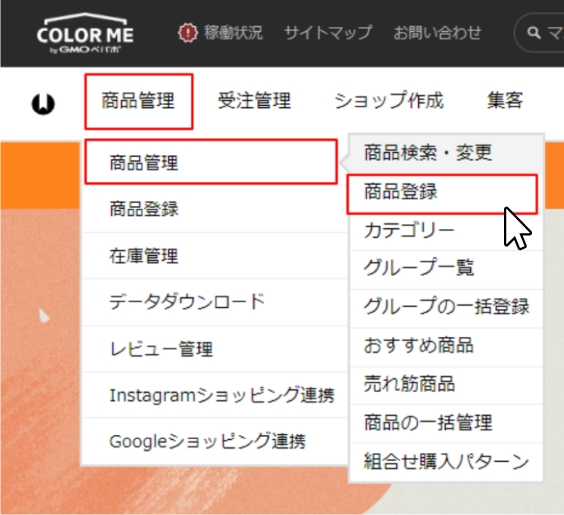 画面上部の共通メニューより、「商品管理」>「商品登録」をクリック