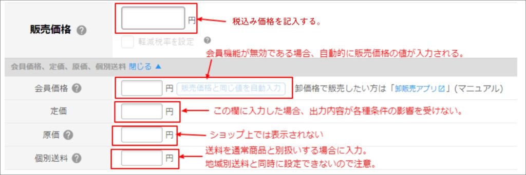 別途設定した価格で販売したい場合「会員価格」欄を使います。
